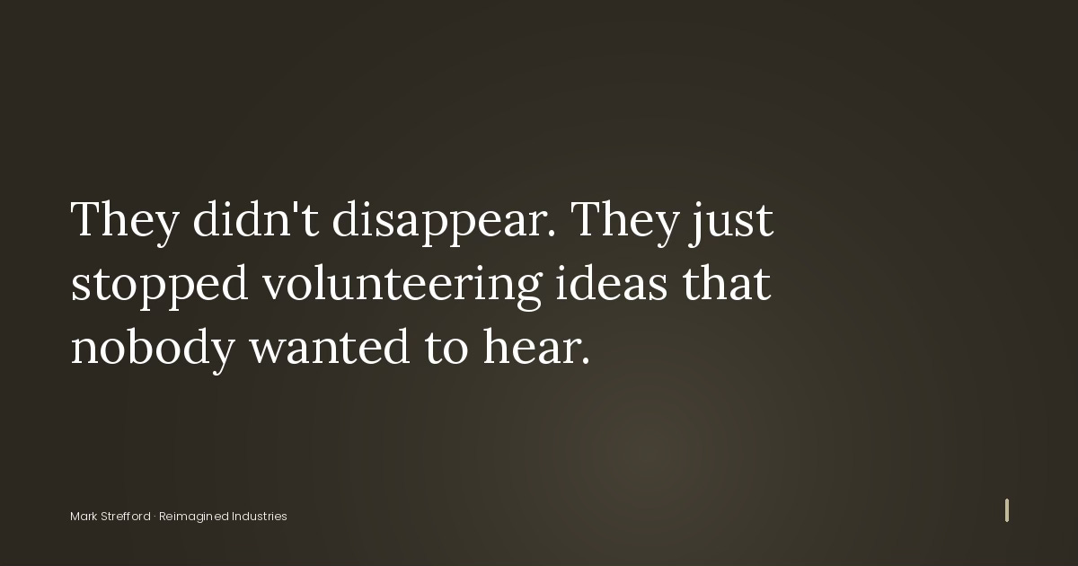 They didn’t disappear. They just stopped volunteering ideas that nobody wanted to hear.